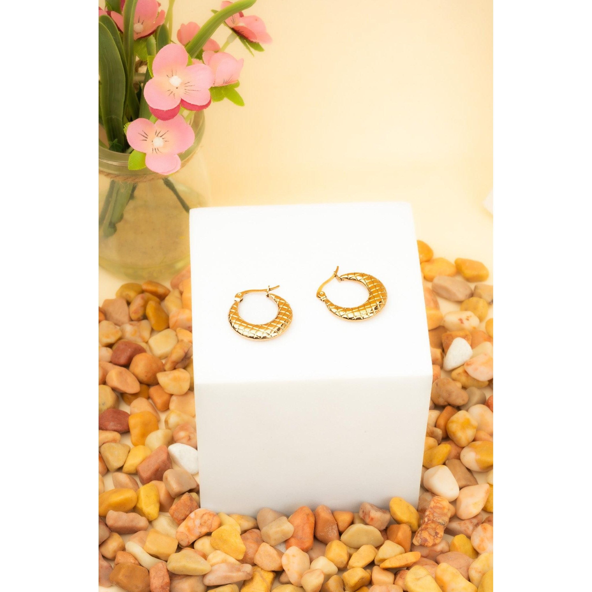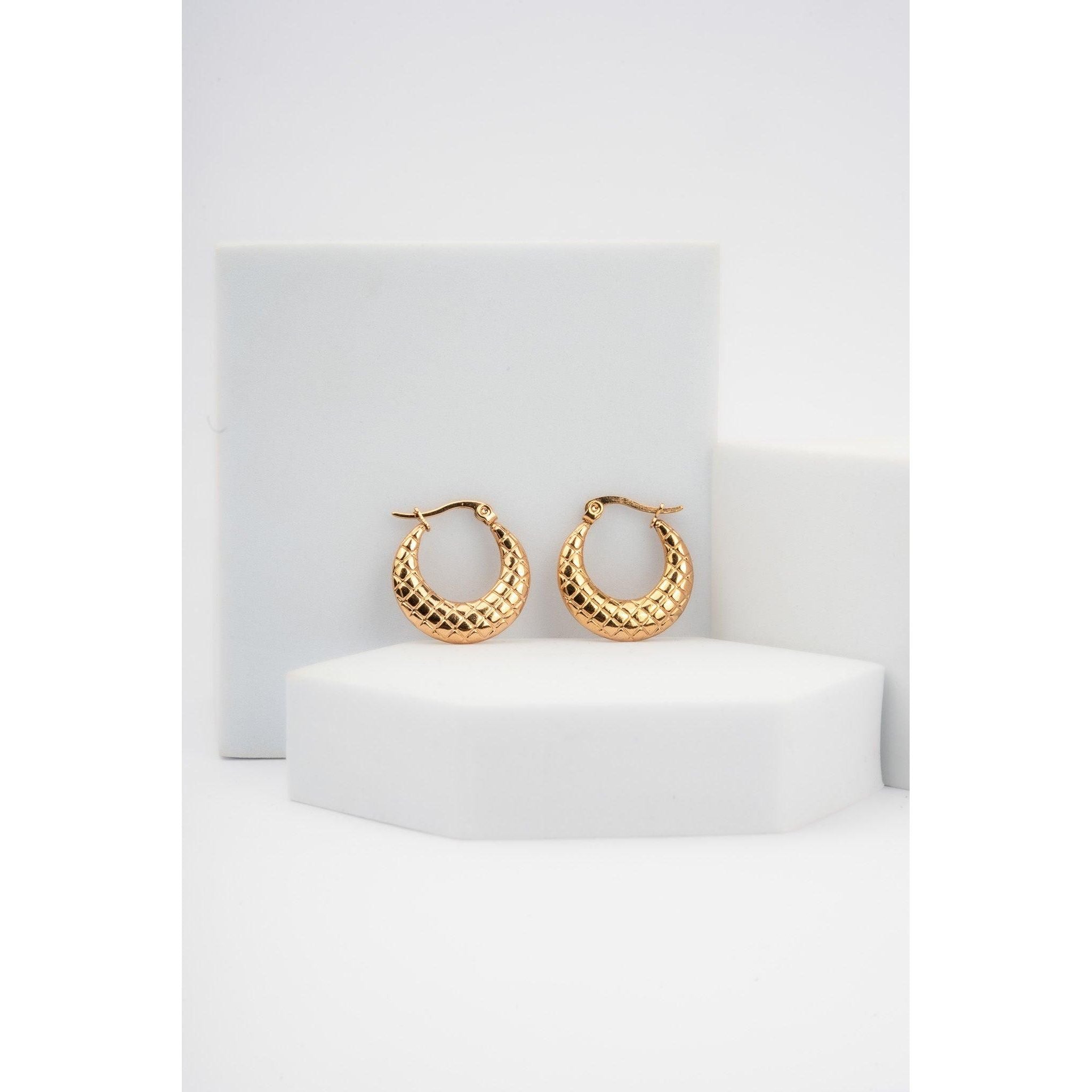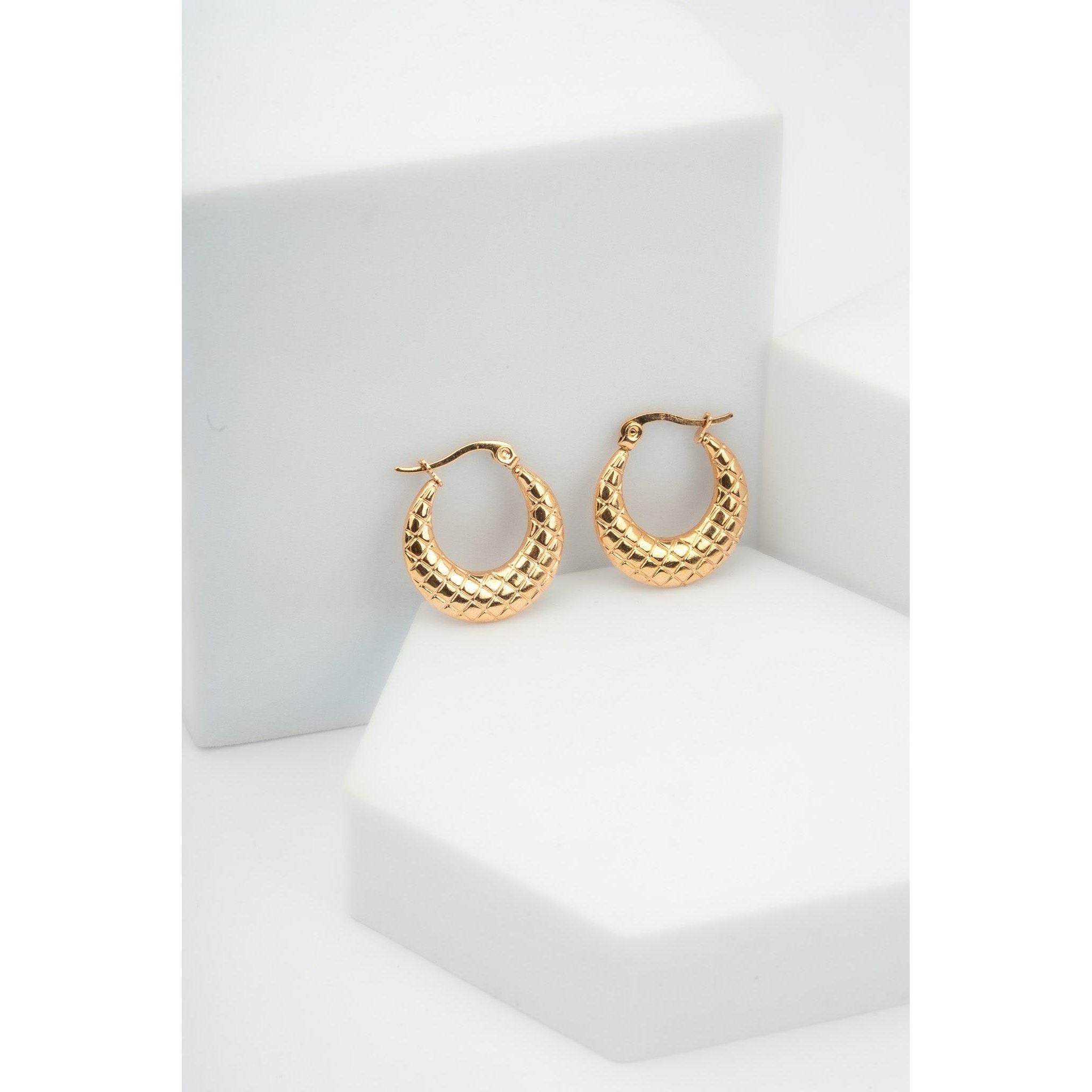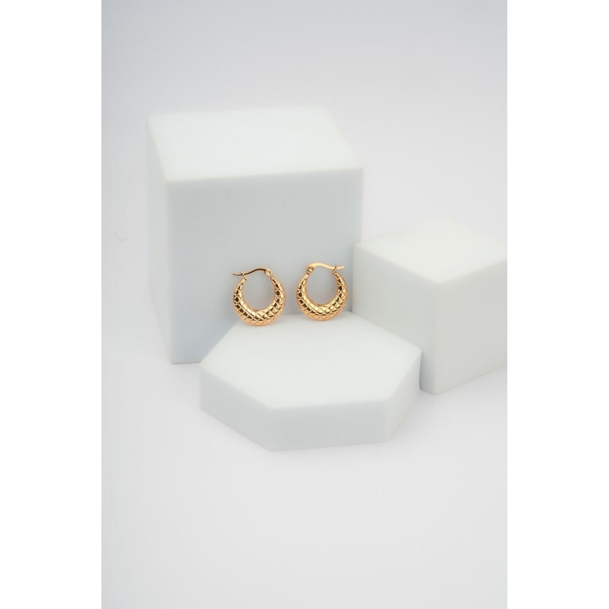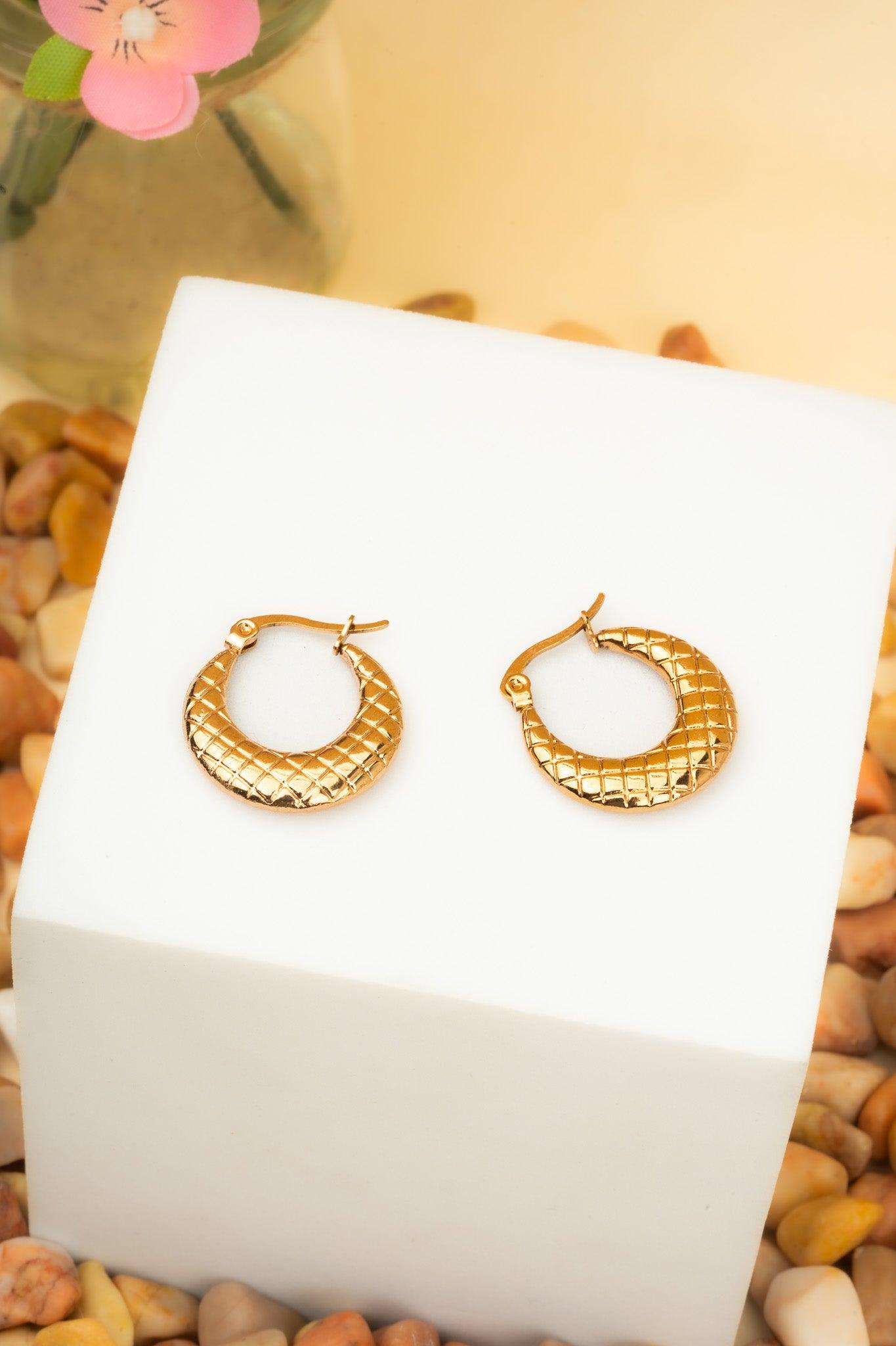 Embossed Quilt Pattern Hoop Earrings, Latch Back Fastening gold tone, stainless steel earring