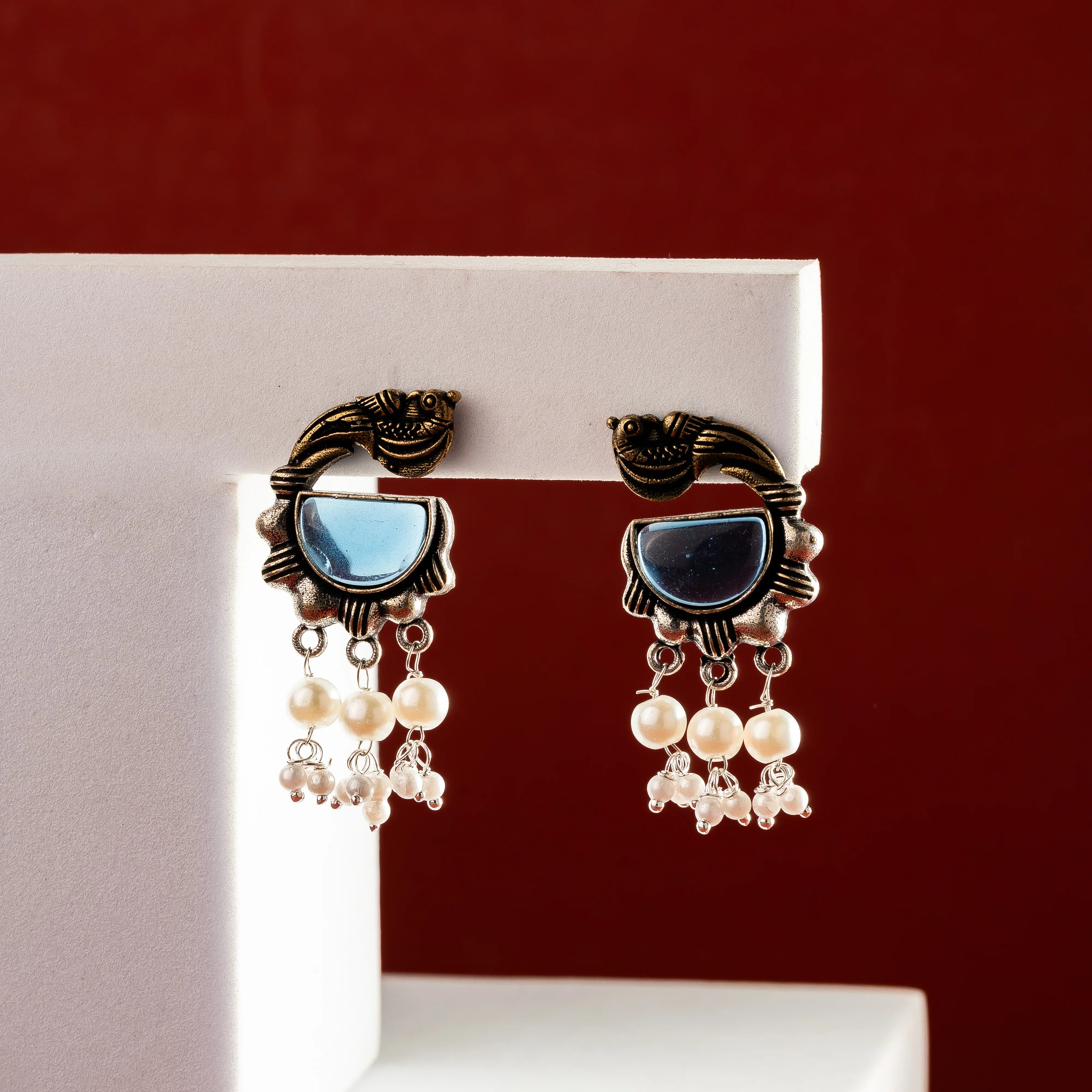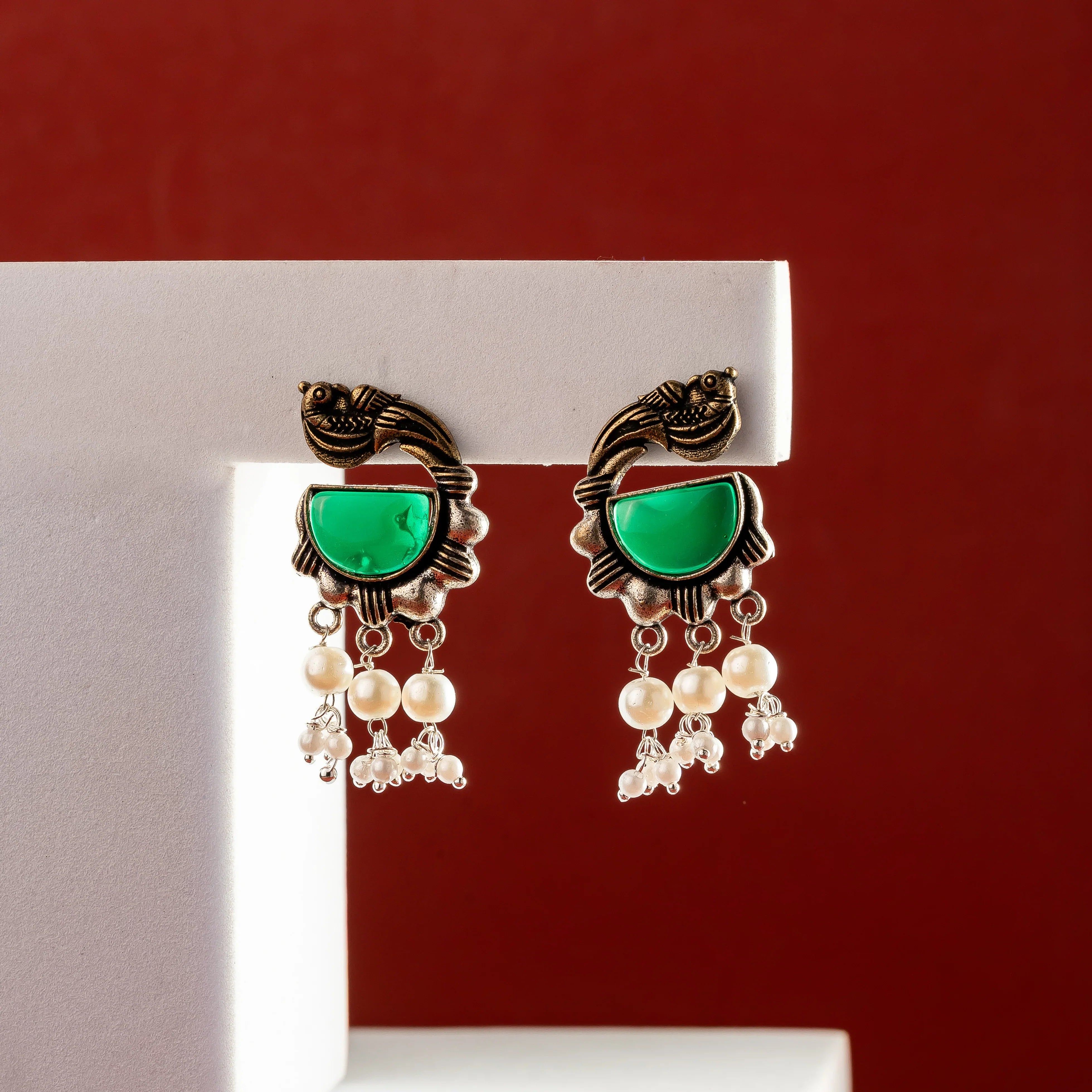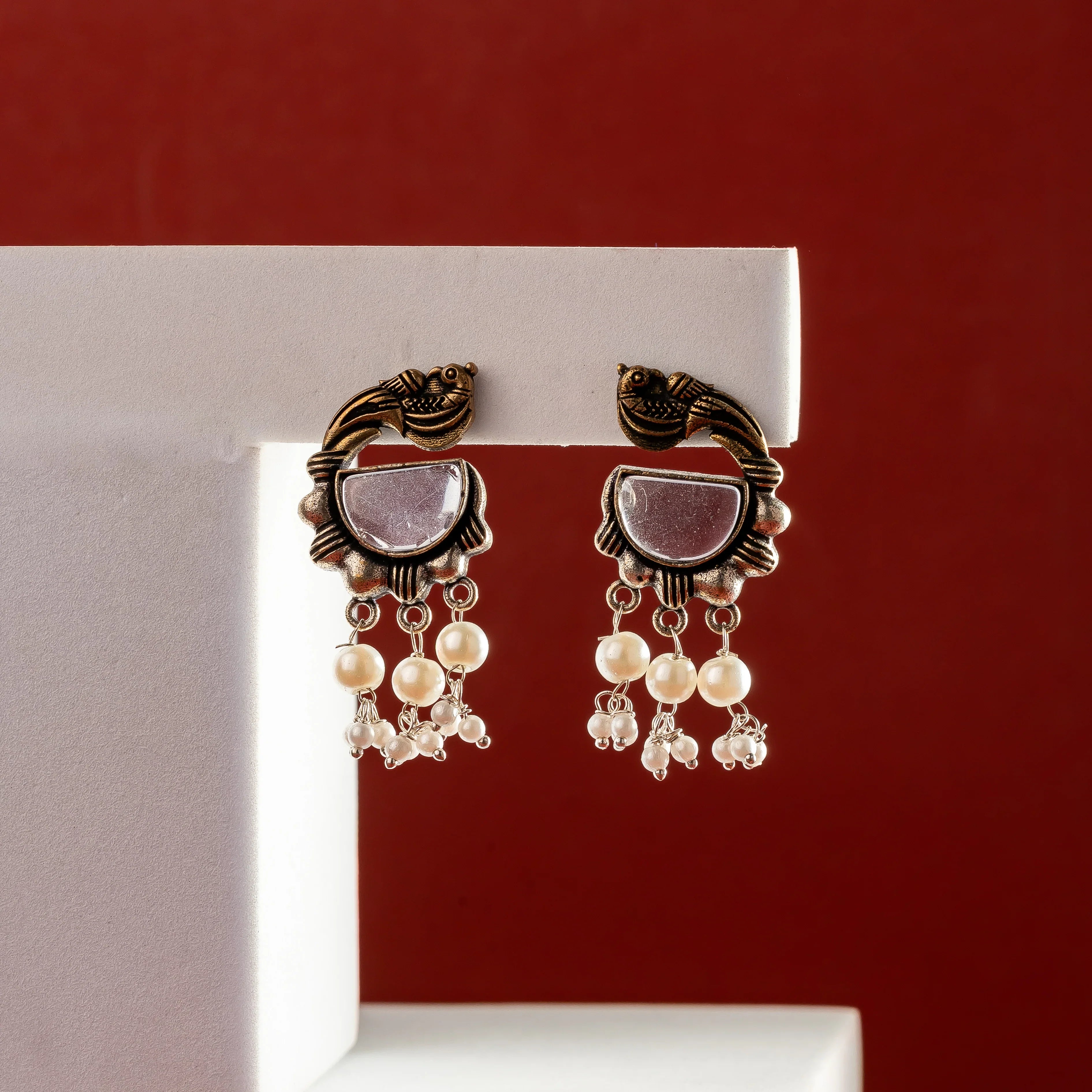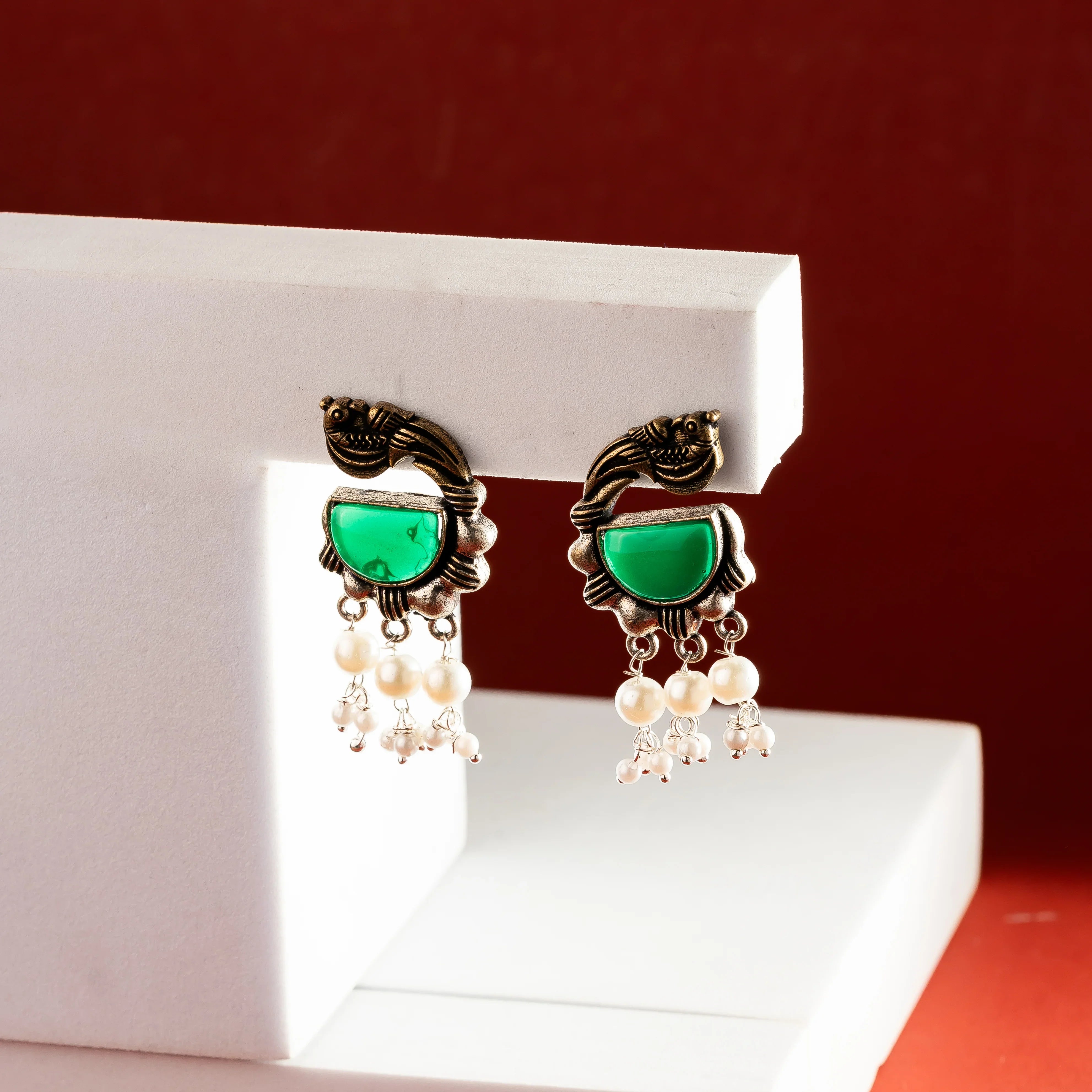 Graceful and grand, the Oxidised Peacock Pearl Layered Earrings merge nature’s elegance with heritage design. Featuring peacock motifs and pearl layers, they are perfect for festive wear. Key Features: Design: Oxidised peacock design with multi-layered pearls Material: Silver-tone alloy and faux pearls Finish: Antique finish with soft shimmer accents Care...