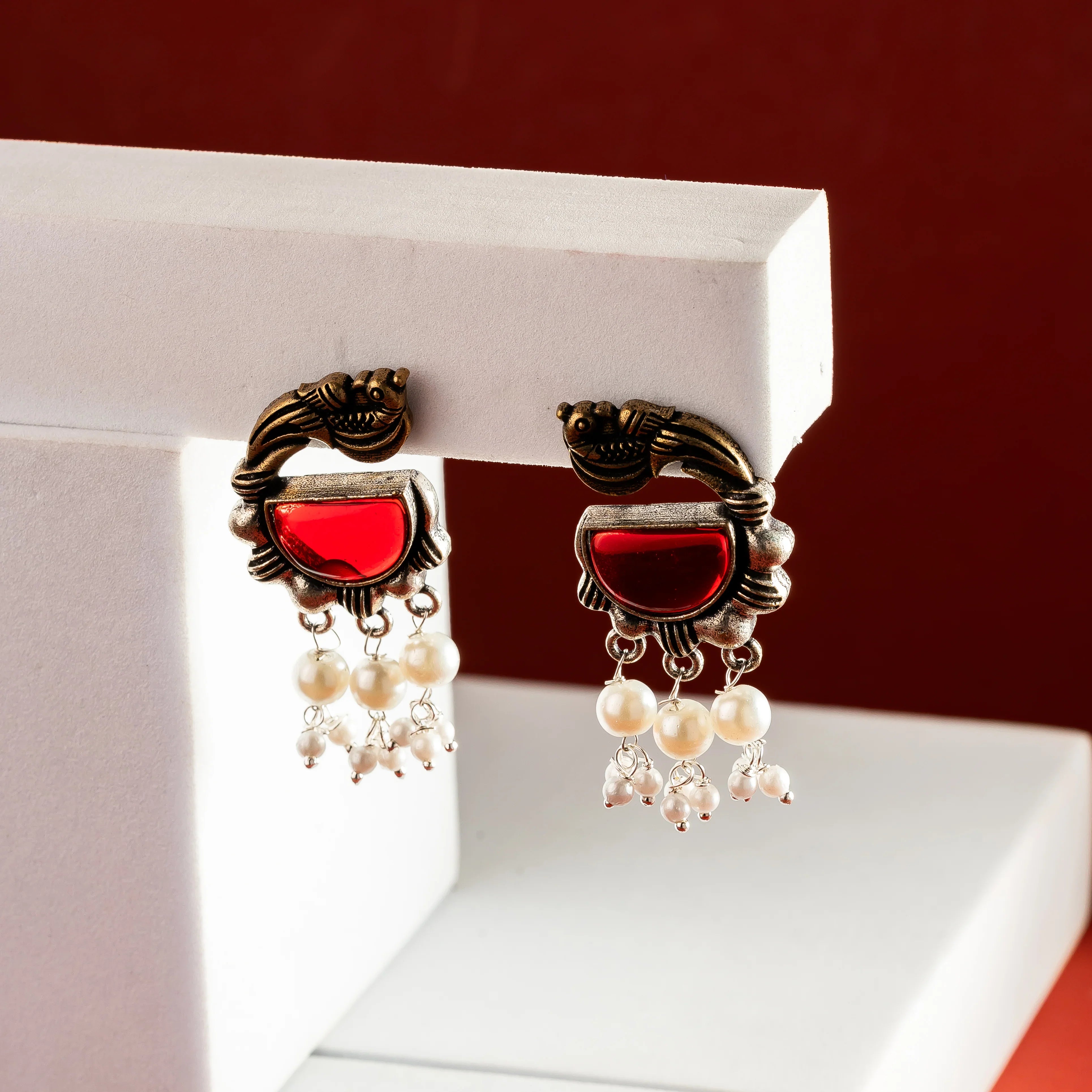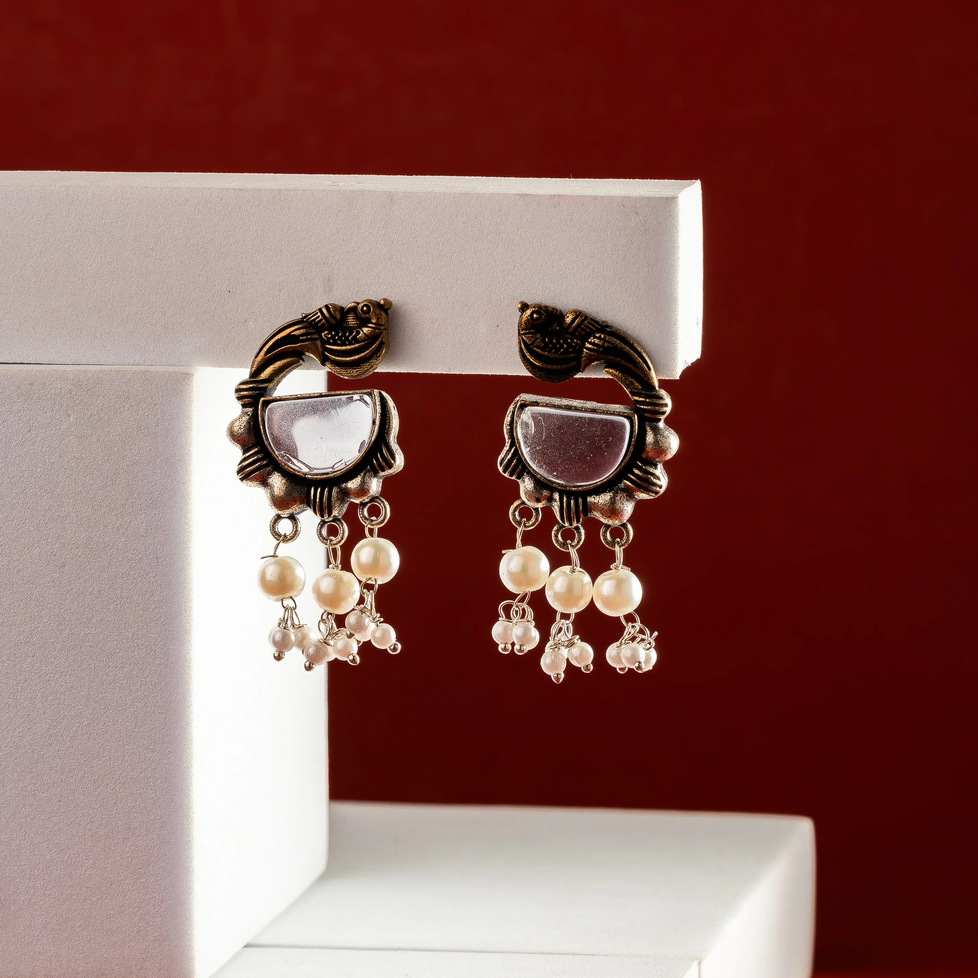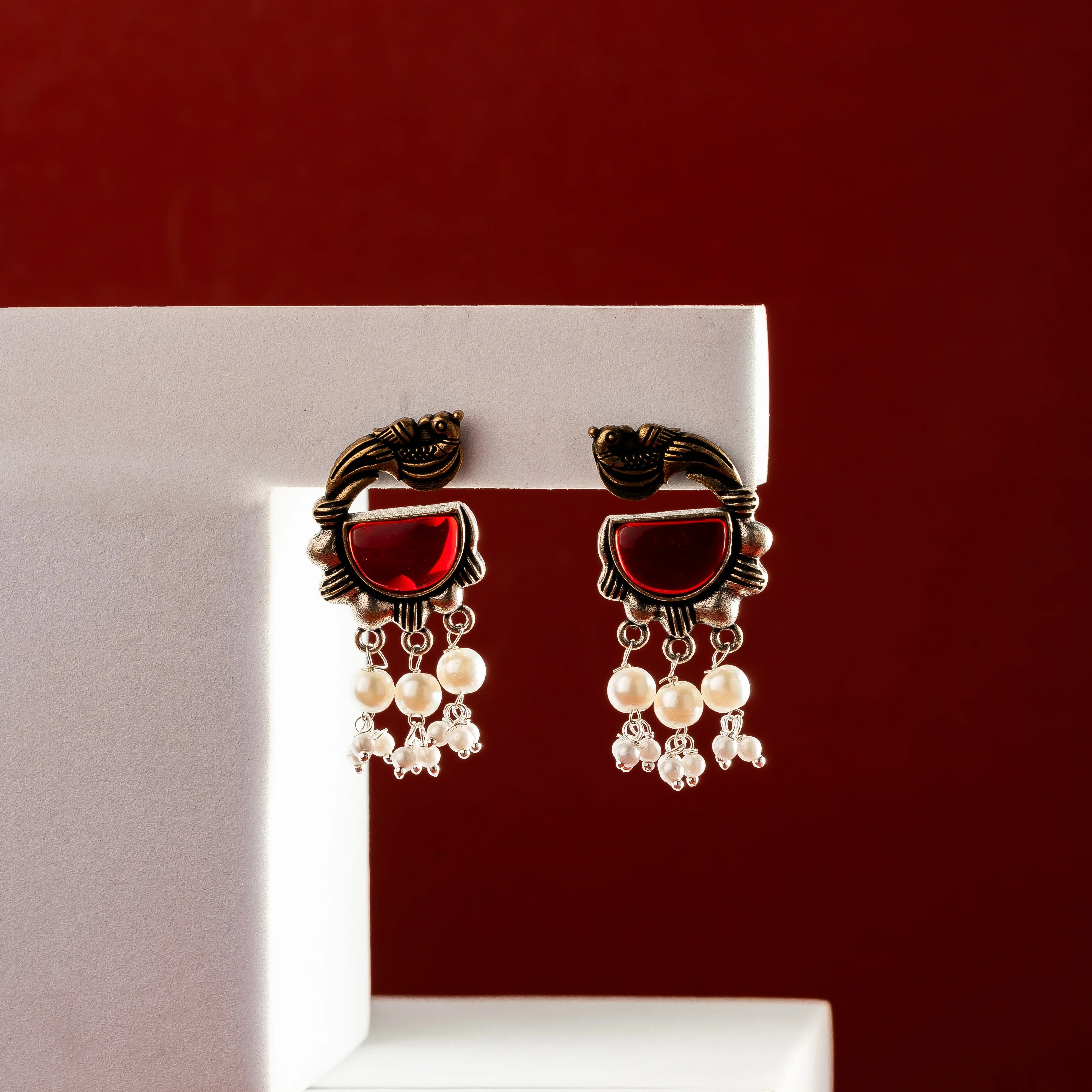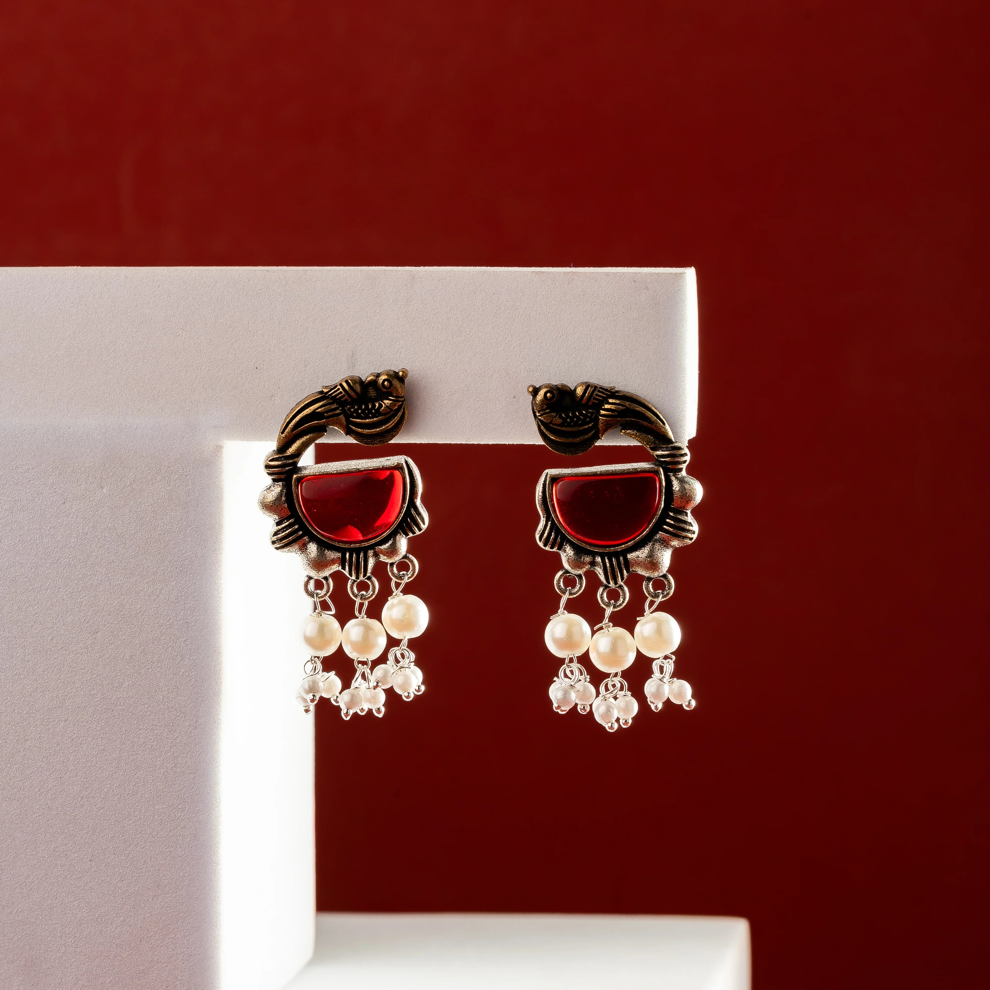Graceful and grand, the Oxidised Peacock Pearl Layered Earrings merge nature’s elegance with heritage design. Featuring peacock motifs and pearl layers, they are perfect for festive wear. Key Features: Design: Oxidised peacock design with multi-layered pearls Material: Silver-tone alloy and faux pearls Finish: Antique finish with soft shimmer accents Care...