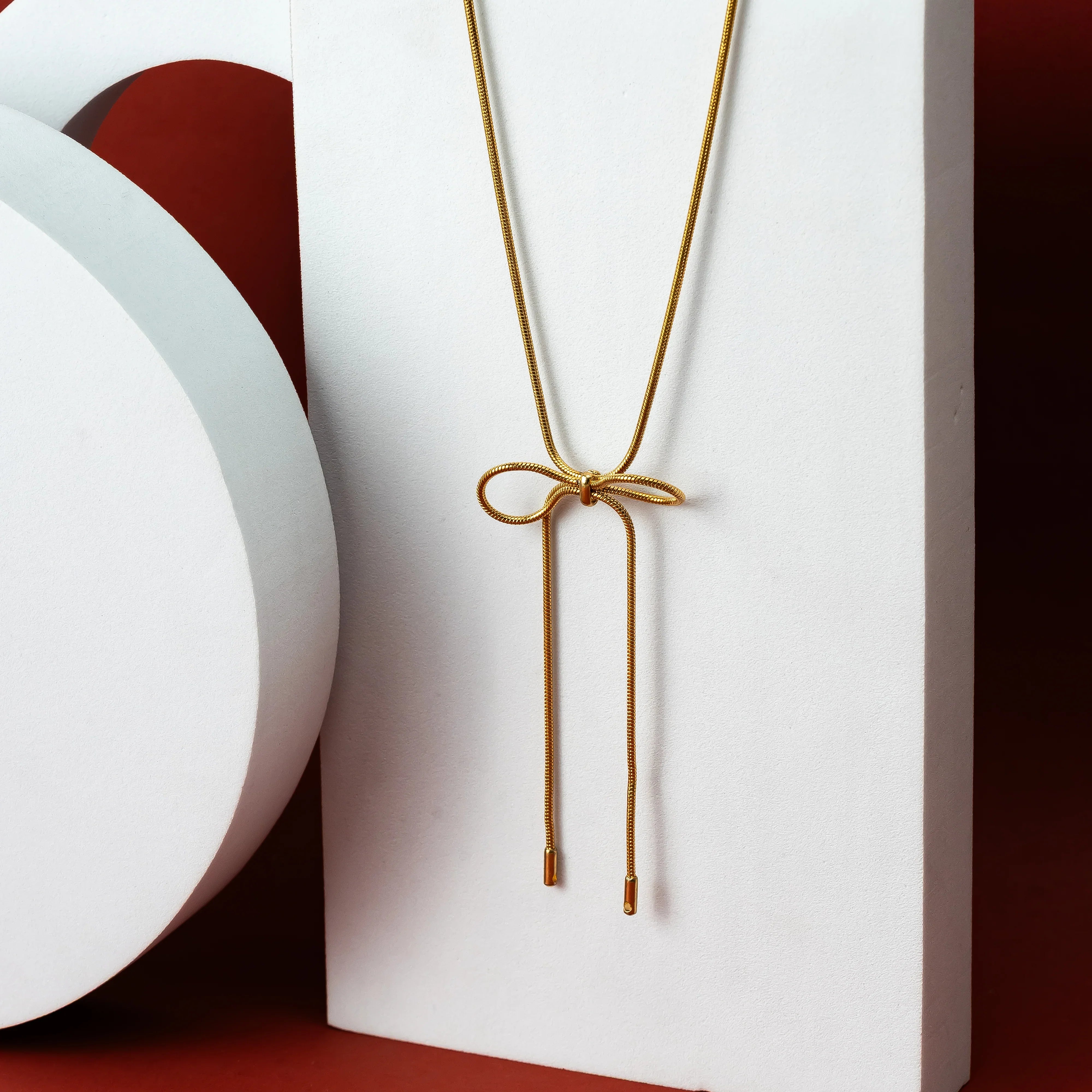 Add a hint of feminine charm with the Bow Tie Necklace. This delicate accessory features a finely crafted bow pendant that sits gracefully at the collarbone, perfect for pairing with both romantic dresses and sleek workwear. A go-to piece for effortless elegance. Key Features: Design: Dainty bow pendant on a...