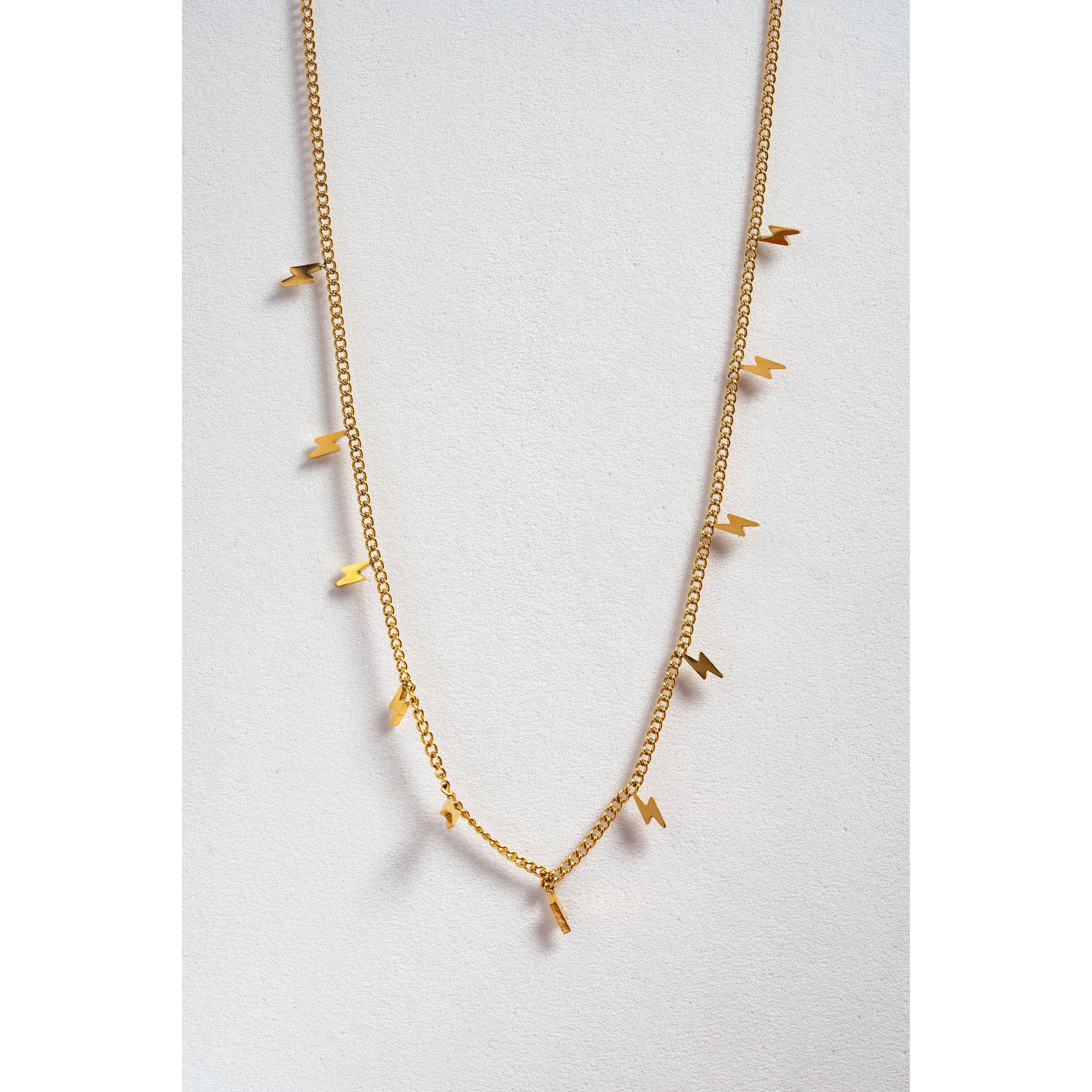 Strike with style in the Lightning Bolt Necklace. A sleek bolt-shaped pendant adds a jolt of personality and power to your ensemble — bold, edgy, and effortlessly cool. Key Features: Design: Lightning bolt pendant on minimalist chain Material: Plated metal alloy Finish: High-gloss finish with protective coating Care Instructions: Avoid...