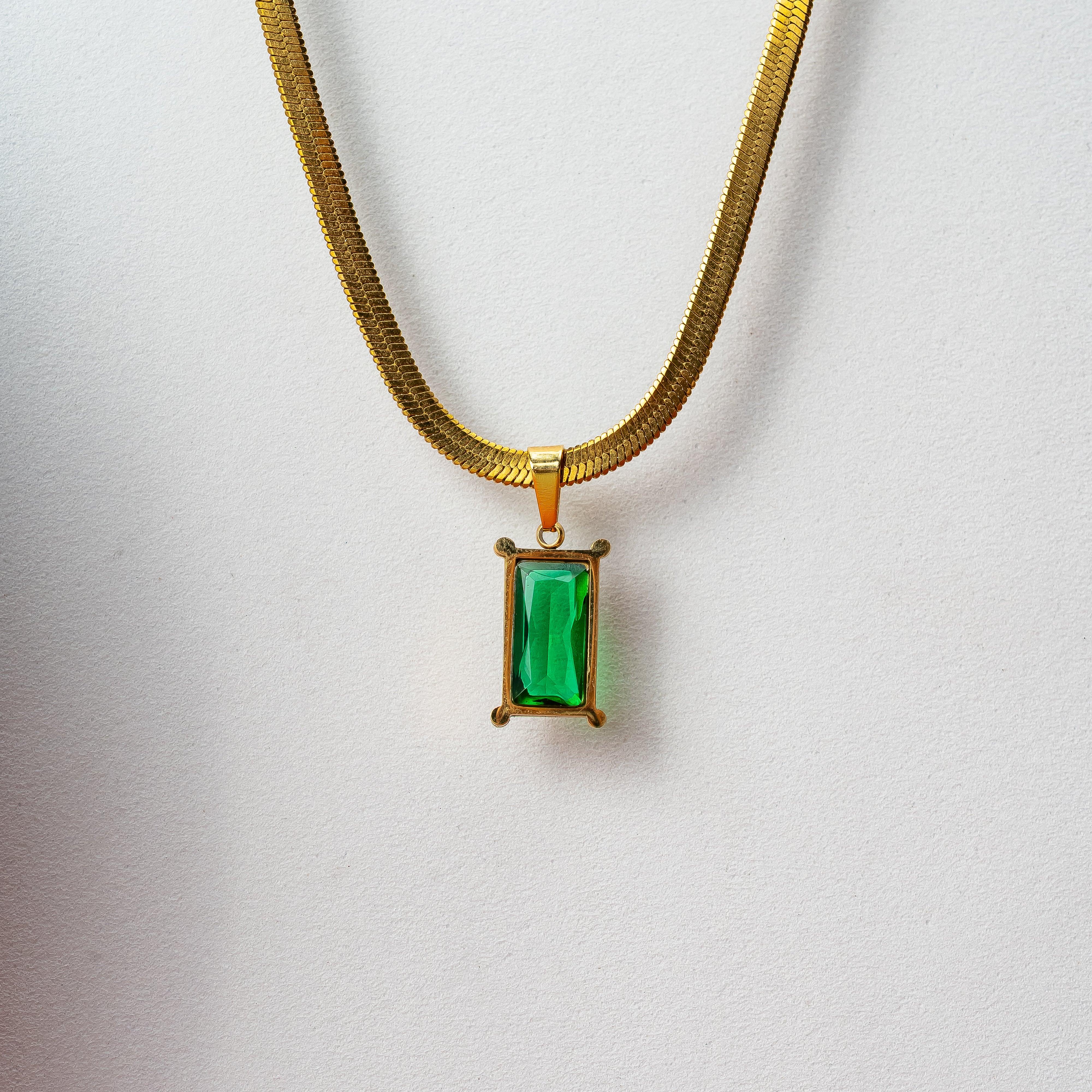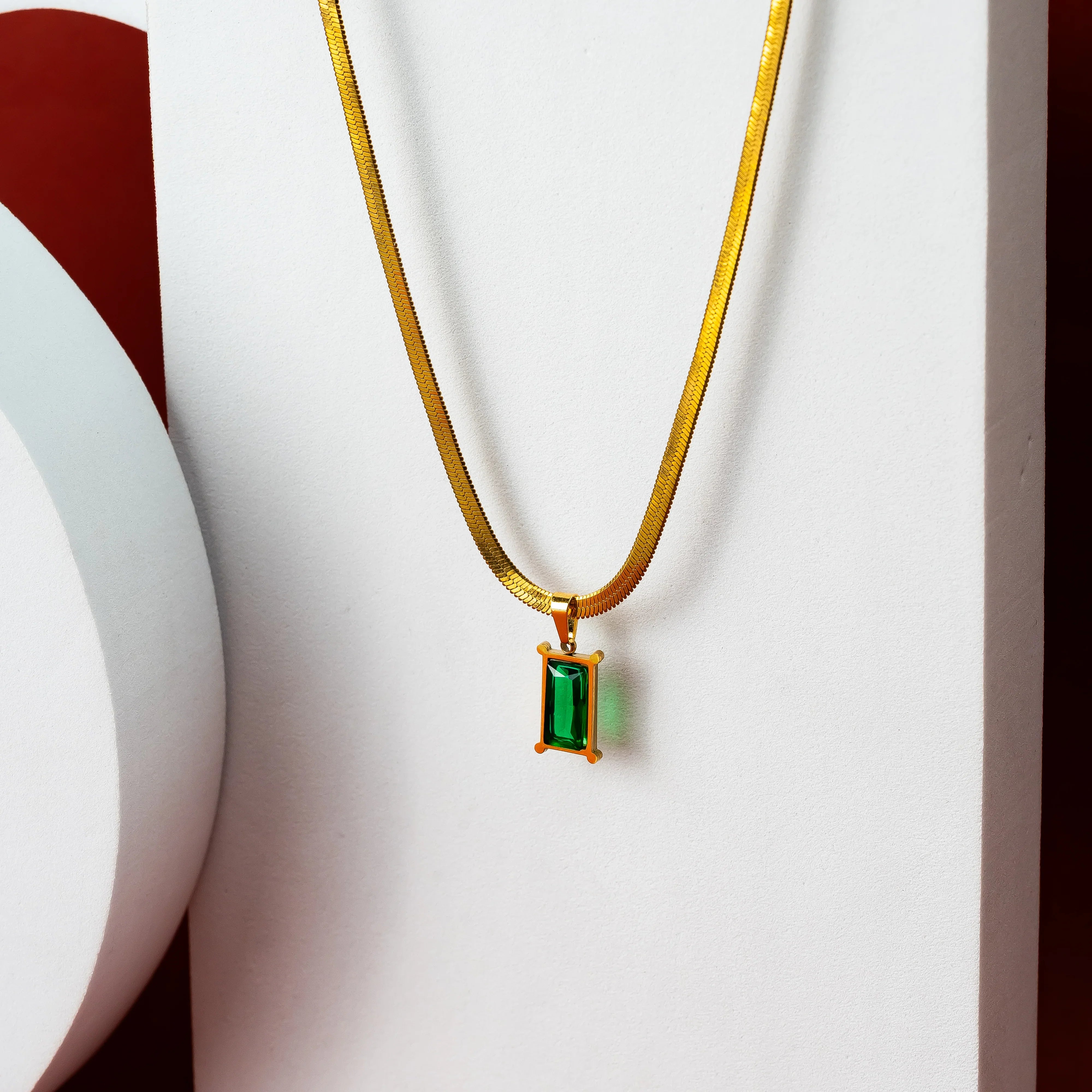 Make a royal statement with the Snake Chain Necklace featuring a bold emerald centerpiece. A luxurious must-have for your gemstone collection.Key Features: Design: Emerald-cut green stone on a fluid snake chain Material: Stainless steel and faux emerald Finish: High-shine gold with vibrant green popCare Instructions: Gently polish with a jewelry...